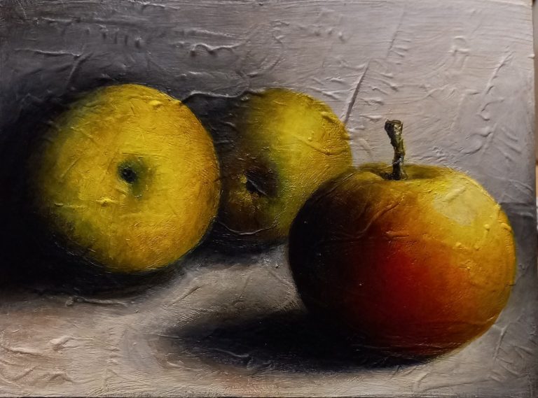 Three windfall apples from a neighbours tree. This year there was a bounty of fruit and I have made alot of apple stew this autumn. I wanted to mark this by painting the apples I had picked of the ground and from the heavy branches full of fruit. Acrylic on a cradled wooden board