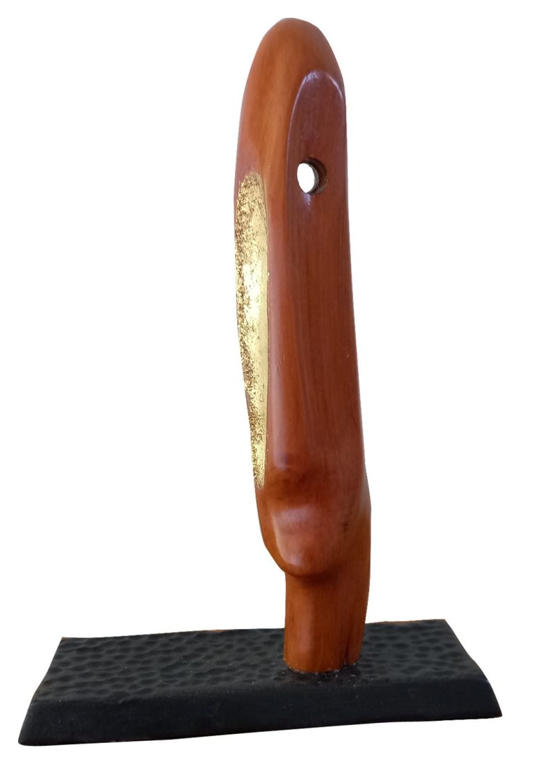 A bogpine sculpture inspired by the prehistoric stone heads. The openings I include are inspired by the whistle hole feature found on some carvings. It is to allow the viewer to look through the wood but also suggests the peering back into its history, millennia ago. It is always gilded to reflect the significance of the ancient timber and to reflect the value of it for me.